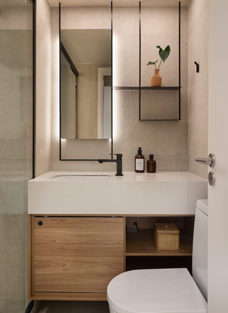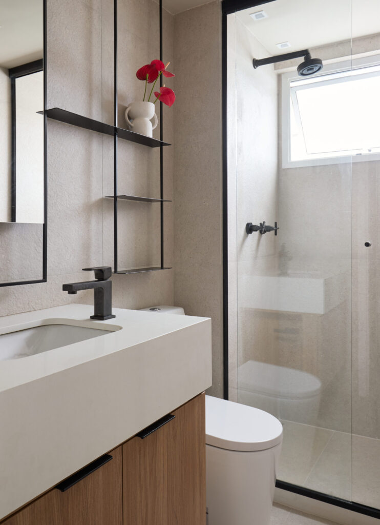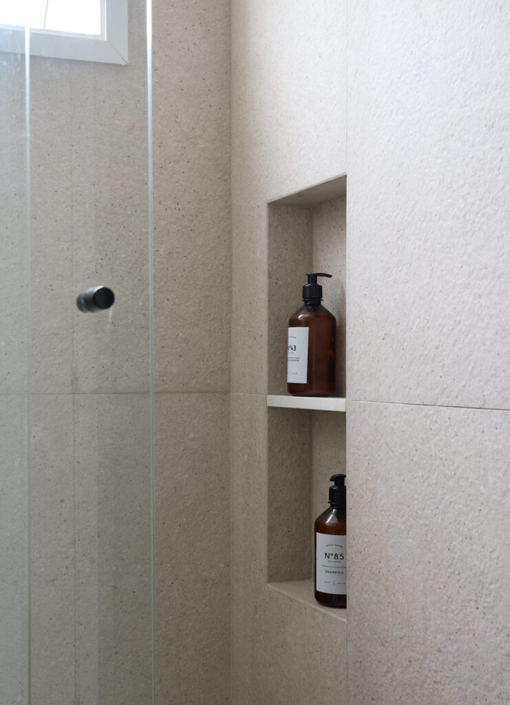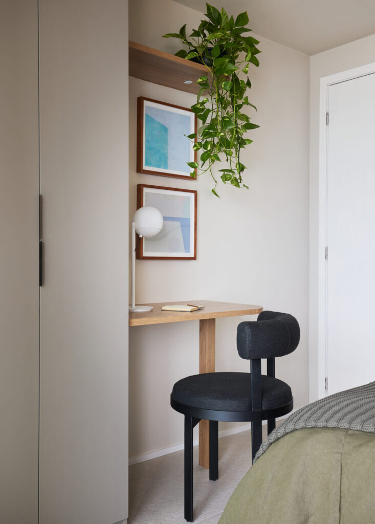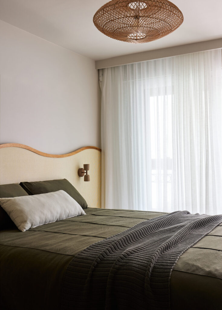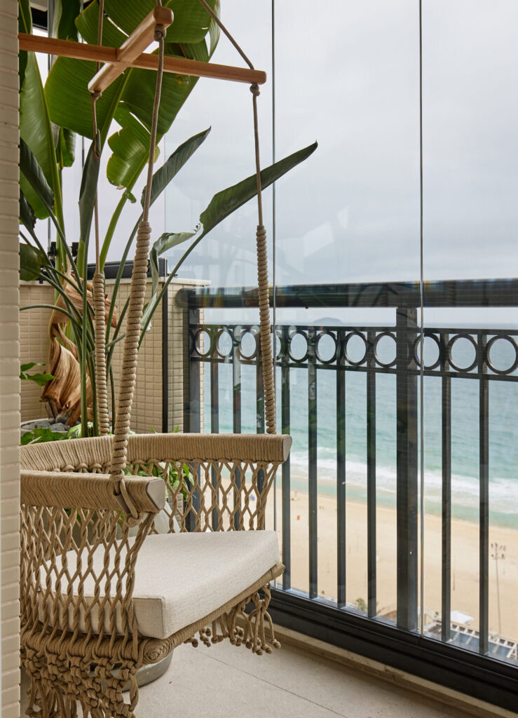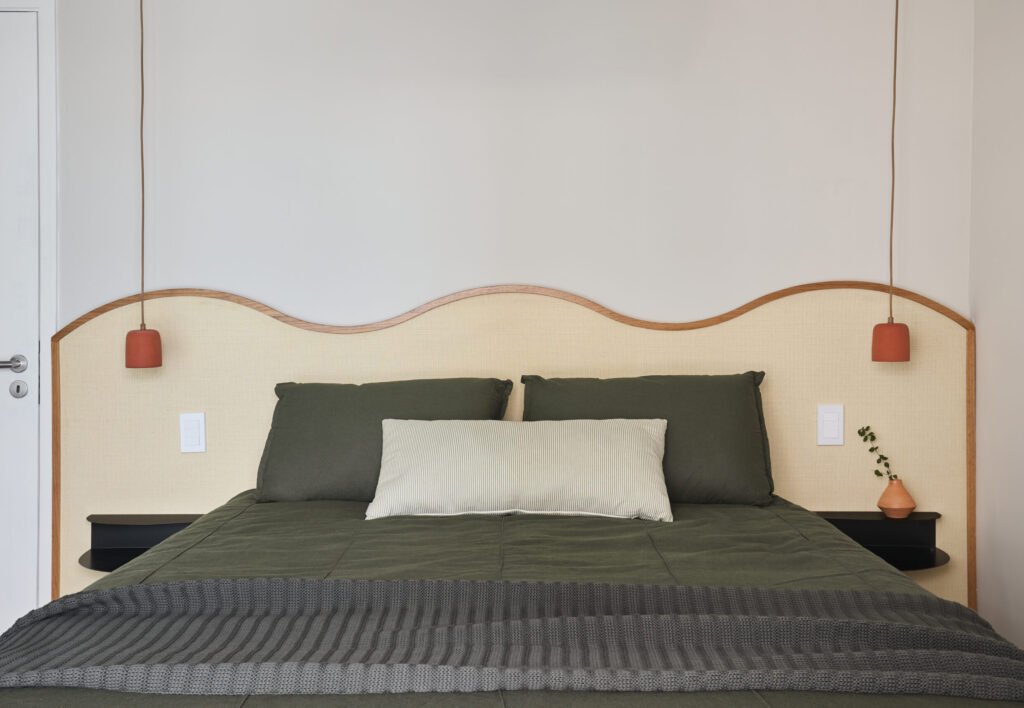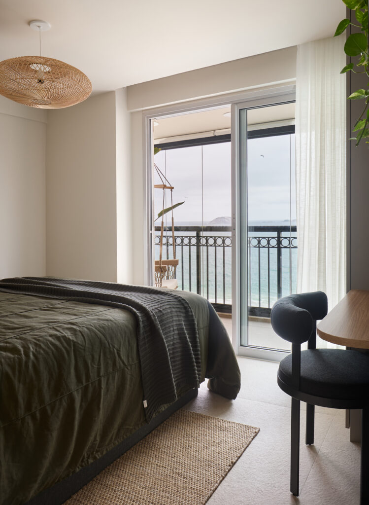 A inspiração na paisagem se estende à área íntima. As ondas do mar foram nossa maior inspiração, e aqui elas se materializaram no desenho da cabeceira, convidando ao descanso e à serenidade. Cada detalhe foi planejado para oferecer uma experiência acolhedora, com uma estética leve e a autêntica bossa carioca.
