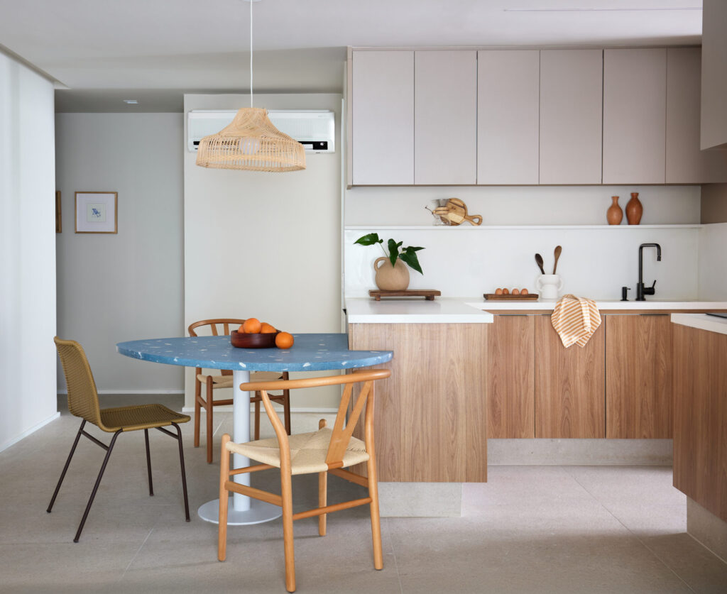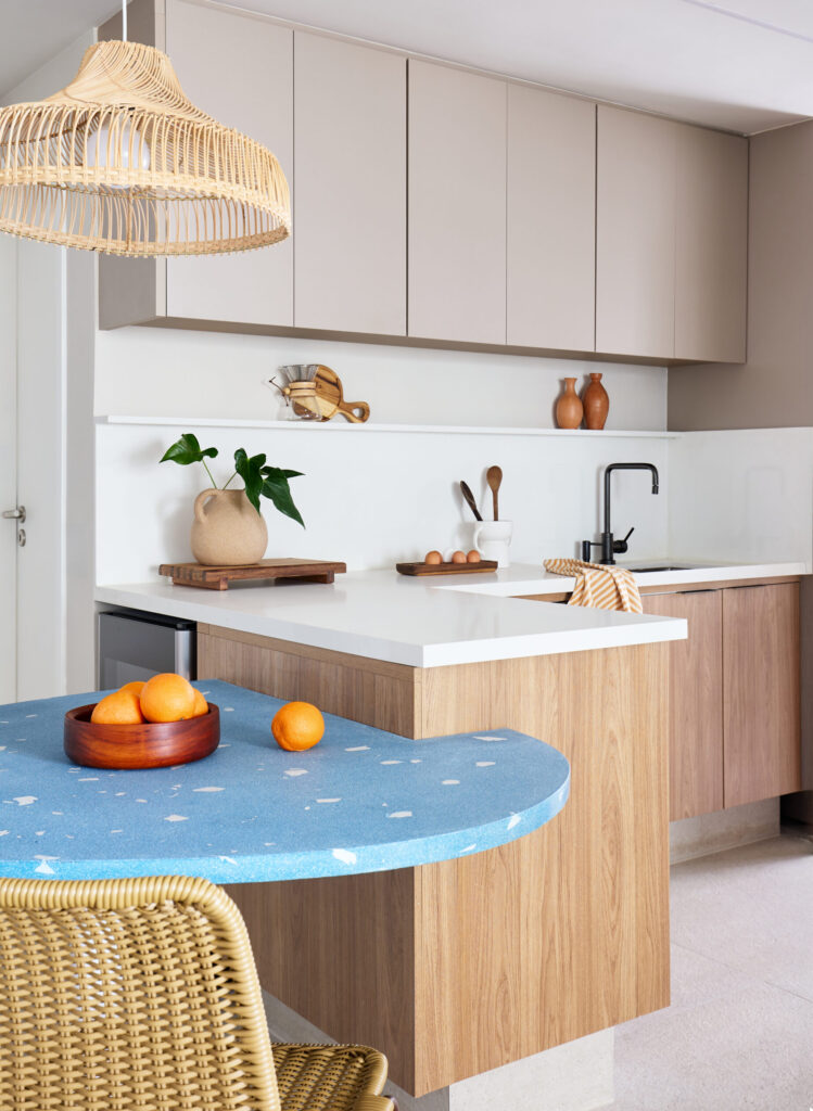 A valorização de materiais artesanais e peças exclusivas foi fundamental para que o espaço ganhasse vida, como o tampo da mesa de jantar, um granilite exclusivo em tons de azul e branco, que se une ao seu desenho orgânico para convidar à interação e à contemplação da paisagem.